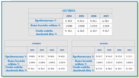 • Egonkortasun hori bera mantendu egiten da gizonen eta emakumeen arteko batez besteko soldata-distantzian, zeina % 10 inguru altuagoa baita lehenen kasuan.