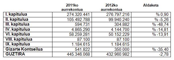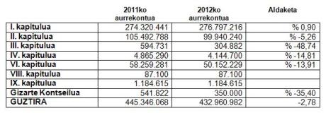 Kapituluei dagokienez, UPV/EHUk 276,75 milioi agindu ditu langileen gastuetarako (I. kapitulua), hau da, guztizkoaren % 64, eta 2011n baino % 0,9 gehiago; 100 milioi gastu arruntetarako (II. Kapitulua), guztizkoaren % 23,09 eta iaz baino % 5, 25 gutxiago; eta, 50,1 milioi inbertsioak egiteko (VI. kapitulua), hau da, aurrekontuaren zenbatekoaren % 11,6, iaz baino % 13,91 gutxiago. Gainerakoa, alegia, aurrekontuaren % 1,5 finantza-gastuetarako, transferentziak egiteko, diru-laguntzetarako eta abarrerako erabiliko da.