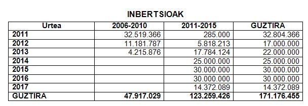 Inbertsioei buruzko kapituluak 6 milioi gutxiago edukitzea uler daiteke, kontuan hartzen baldin bada: batetik, 2005-2010 aldirako Urte Anitzeko Inbertsio Planaren barruan aurreikusitako lan batzuk jada amaitu direla; eta, bestetik, gaur egungo plana, 2017ra arte luzatua, gauzatzeko epeak luzatu egin direla. Honela geratu da: