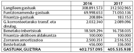 - 312,50 milioi euro langileen gastuetara (I. Atala), guztizkoaren %77 eta 2016an baino %1,17 gehiago