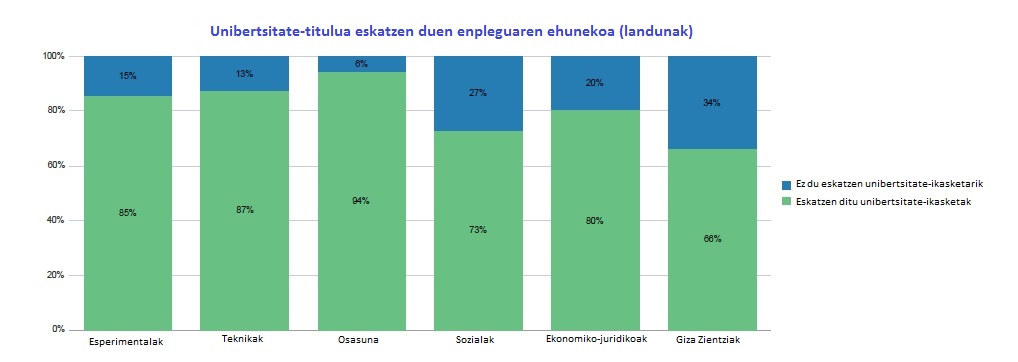 • Unibertsitate-titulazioa eskatzen duten pertsona landunen batez besteko enplegu-ehunekoa % 81 da. Diziplinen arabera, handienetik txikienera, Osasun Zientziak ageri dira (% 94), ondoren Teknikoak (% 87), Esperimentalak (% 85), Ekonomiko-juridikoak (% 80), Gizarte Zientziak (% 73) eta Giza Zientziak (% 66).