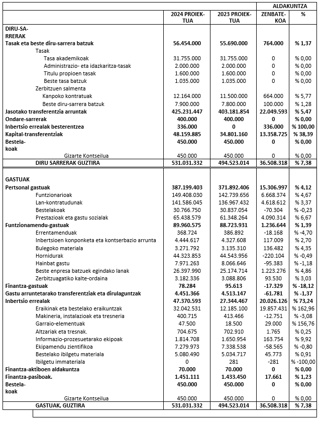 Euskal Herriko Unibertsitateko Gizarte Kontseiluaren osoko bilkurak argi berdea eman zion gaur eguerdian UPV/EHUren 2024rako aurrekontuari, unibertsitate horretako Gobernu Kontseiluak joan den otsailaren 22an onartutako proiektua eta proiektu horri buruz Gizarte Kontseiluko Ekonomia eta Finantza Batzordeak egindako txostena aztertu ondoren. Guztira, euskal unibertsitate publikoak 531 milioi euroko aurrekontua izango du aurten, 2023an baino % 7,3 gehiago.