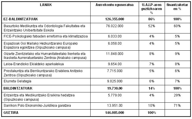 · Bizkaiko campusean ia 100 milioi euro, Gipuzkoakoan 25 milioi euro eta Arabakoan 21 milioi euro inbertitzea barne hartzen du.
