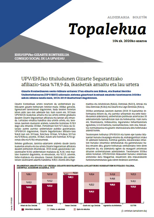 Universidad del País Vasco/Euskal Herriko Unibertsitatearen Gizarte Kontseiluak gaur Bilbon egindako urteko azken osoko bilkuran aztertu dira UPV/EHUko ikasle egresatuak laneratzeko azterlanaren 2019ko emaitzen aurrerapenari buruzko datu horiek eta beste batzuk. Saio hori izan da, halaber, Nekane Balluerka errektorearen azken saioa, kargua utzi aurretik.